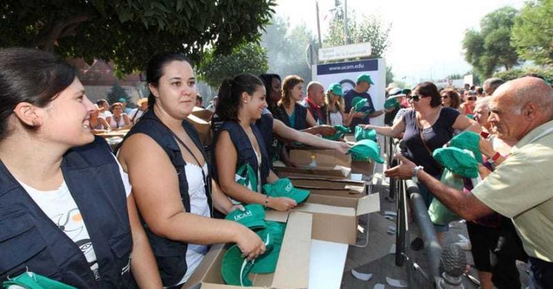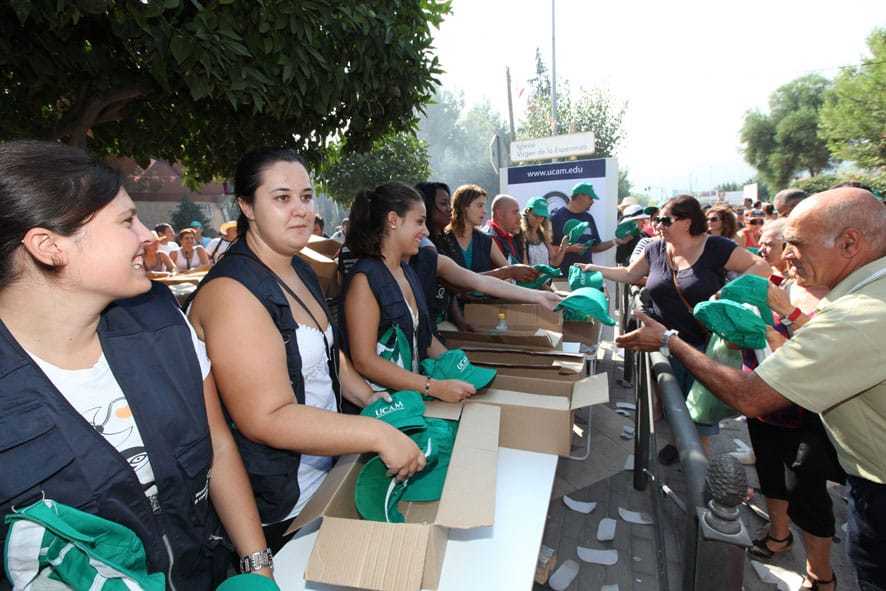 La Universidad repartió a los romeros, desde primera hora de la mañana, en la puerta de la parroquia de Nuestra Señora de la Esperanza, en el Barrio del Progreso, gorras, y camisetas que permitieron a los asistentes combatir el calor que todavía persiste. Además, los voluntarios de la UCAM entregaron como recuerdo de esta Romería, estampas con la imagen y el himno a Nuestra Señora de la Fuensanta.