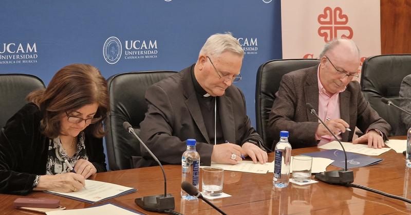 Monseñor José Manuel Lorca Planes, obispo de la Diócesis de Cartagena; María Dolores García, presidenta de la Universidad Católica de Murcia, y José Antonio Planes, director de Cáritas en la Región de Murcia, han rubricado un acuerdo de colaboración que recoge la puesta en marcha de nuevas iniciativas como los programas para facilitar la inserción laboral de personas en riesgo de exclusión, la atención a personas mayores, así como la recogida de ropa y calzado.