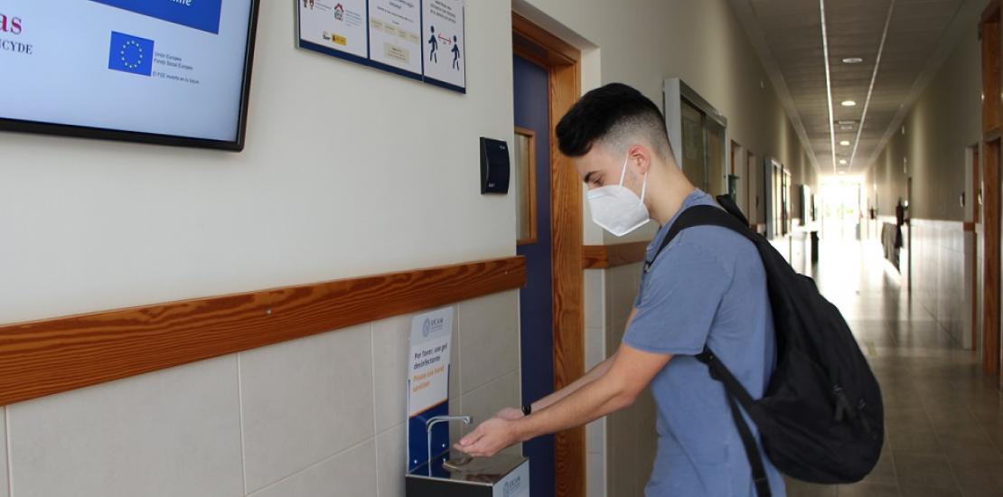 La UCAM ha elaborado un protocolo con las medidas de seguridad más adecuadas para que sus campus tengan las máximas garantías posibles frente al coronavirus. Este protocolo engloba diferentes medidas como la disposición de señalética por todo el campus que facilitan el mantenimiento de la distancia de seguridad y cartelería con un decálogo de recomendaciones higiénicas tales como el uso obligatorio de la mascarilla, la limpieza de manos, entre otras, con el objetivo de evitar contagios de COVID. Al tiempo, se han realizado test serológicos a todos los profesores y personal de administración y servicios antes del inicio del curso.