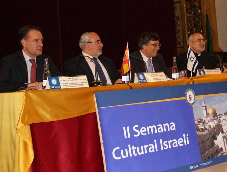 En el acto inaugural de la II Semana Cultural Israelí, intervinieron, junto al presidente de la UCAM, el vicerrector de Extensión Universitaria y coordinador del Centro Universitario Hispano-Israelí, Antonio Alcaraz; el embajador de Israel en España, Alon Bar, y el embajador en Misión Especial para las Relaciones con las Comunidades y Organizaciones Judías, Álvaro Albacete.