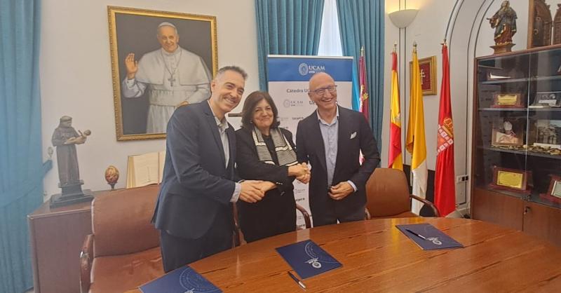 María Dolores García Mascarell, presidenta de la UCAM, y los codirectores de la nueva cátedra, Federico Juárez, socio director de AI Educonsulting, y Ángel López Naranjo, director de Target Business School, han rubricado el documento para oficializar su puesta en marcha.
