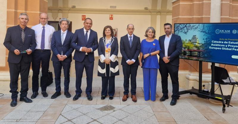 El Claustro del Monasterio de los Jerónimos, sede de la Universidad en Murcia, ha acogido esta mañana el acto de presentación de la Cátedra, en el que han intervenido María Dolores García, presidenta de la UCAM; Lucio de Sousa, catedrático en la Tokyo University of Foreign Studies y director de este nuevo proyecto; Antonio Caballero, director general de Universidades e Investigación de la Región de Murcia; Pablo Blesa, coordinador de la Cátedra y catedrático de Relaciones Internacionales y vicerrector de Relaciones Internacionales, de la Católica, y Estrella Núñez, vicerrectora de Investigación. También han estado presentes en el acto, dado el carácter transnacional de la Cátedra, los destacados investigadores del panorama internacional, Christopher Rossi, profesor en The Arctic University of Norway, y Gunnar Rekvig, director de Planning and Coordination Department, The SasaKawa Peace Foundation (Tokyo) y profesor en la Universidad de Lisboa, que participarán en ella.