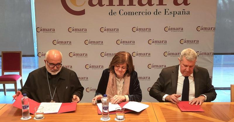 La sede de la Fundación INCYDE de las Cámaras de Comercio de España en Madrid ha acogido este miércoles la firma de un acuerdo marco de colaboración entre la UCAM e INCYDE con la Diócesis de Carúpano, en Venezuela. Previamente, María Dolores García, presidenta de la Universidad, se ha reunido con Javier Collado, director general de INCYDE y con monseñor Jaime Villarroel, obispo de Carúpano, para constatar el objetivo común de las tres instituciones de promover el espíritu empresarial como motor de desarrollo socioeconómico y plantear el despliegue de un programa de formación en emprendimiento, asesoramiento y capacitación en el territorio venezolano. En el encuentro han estado presentes también José Luis Bonet, presidente de la Cámara de Comercio de España y Doctor Honoris Causa por la UCAM; Gonzalo Wandosell, el decano de la Facultad de Ciencias Jurídicas y de la Empresa y director de la Cátedra UCAM Emprendedores, y María Mendoza, miembro del Consejo de Gobierno de la Universidad.