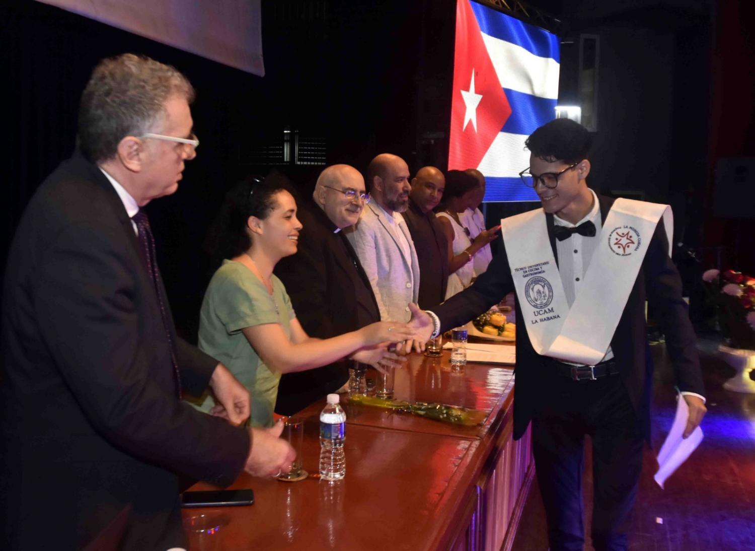 Esta semana han sido 200 alumnos del país caribeño los que se han graduado por la Católica de Murcia como técnicos universitarios en cocina y gastronomía, en la octava edición de este programa formativo. En el acto, celebrado en el Teatro Lázaro Peña de La Habana, han participado Ángel Aguilera, coordinador general del Proyecto; Antonio Alcaraz, coordinador académico y vicerrector de Extensión Universitaria de la UCAM, y Gonzalo Wandosell, decano de la Facultad de Economía y Empresa de esta universidad. A él han asistido autoridades locales como Maikel Borrás, vicepresidente de la Asamblea Municipal del Poder Popular de la Habana Vieja; Eddy Fernández, presidente de la Federación de Asociaciones Culinarias de Cuba, así como representantes del Ministerio de Educación y de la Oficina del Historiador de La Habana.