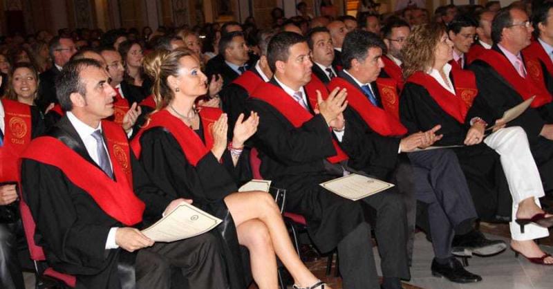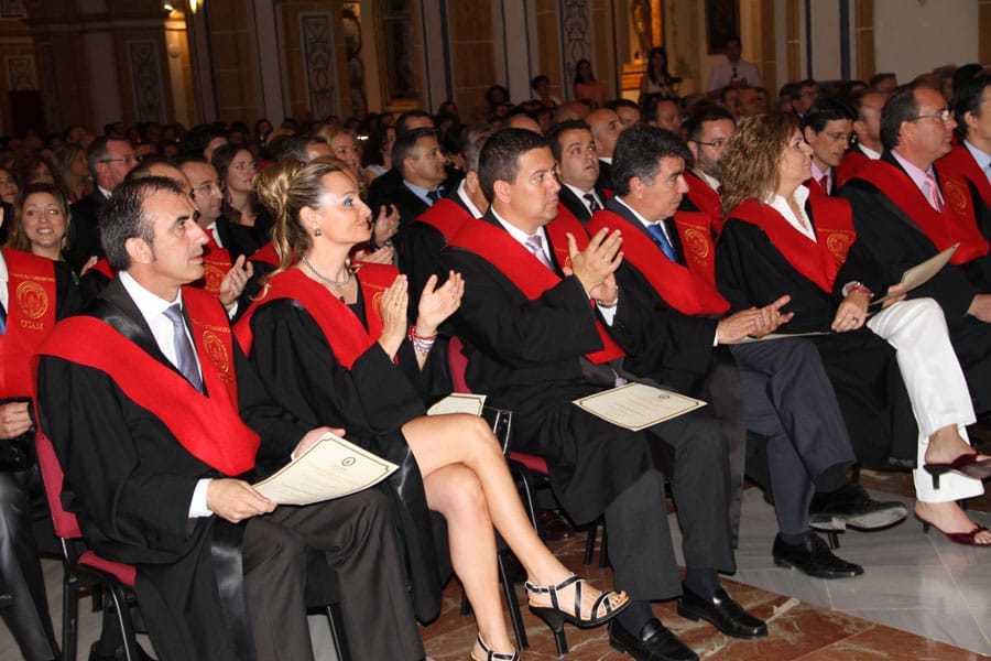 El Templo del Monasterio de Los Jerónimos, sede de la Universidad Católica San Antonio (UCAM) acogió el pasado sábado 2 de junio la emotiva ceremonia de entrega de Becas y Diplomas acreditativos, a los alumnos de la I Promoción del Grado Oficial en Derecho, de la UCAM. La rectora de la Universidad, Josefina García Lozano, presidió el solemne acto acompañada por el Vicedecano de Derecho, Francisco de la Torre Olid, y por el Secretario de Estado de Seguridad, y Padrino de los flamantes graduados, Ignacio Ulloa. El docente, Jaime Sánchez Vizcaíno, ejerció como Profesor Honorífico, mientras que la lectura de nombres a de los alumnos, correspondió al profesor, y Secretario Académico de Derecho, Francisco Martínez Rivas. Cabe destacar que la lectura del discurso a los estudiantes correspondió al alumno, Diego de la Cotera.