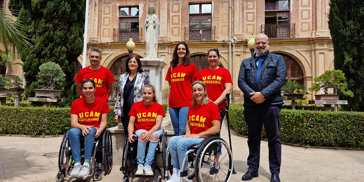 Las jugadoras Sonia Ruiz (capitana del Club y de la Selección), Beatriz Zudaire, Lourdes Ortega y Vicky Vilariño, la fisioterapeuta Marta Vargas y el seleccionador Franck Belén forman la representación UCAM que forma parte de la Selección Española de Baloncesto en Silla de Ruedas que disputará el Mundial en Dubái en junio. Antes de partir para Madrid, donde se concentrarán con el resto del equipo nacional, han mantenido un encuentro con María Dolores García, presidenta de la Universidad Católica de Murcia, y Pablo Rosique, director de Deportes de la institución docente en el Campus de Los Jerónimos.