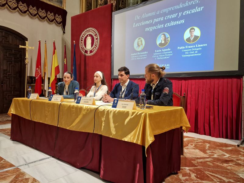 Durante el encuentro se celebró una mesa redonda, moderada por Fran Sáez, en la que participaron tres alumni que han alcanzado el éxito en sus respectivas trayectorias: Anabel Hernández, creadora de ‘Mira qué plan’; Lucía Aguado, CEO de Saiyan Workout; y Pablo Franco, CEO de Embargos a lo Bestia. Los ponentes resaltaron la importancia de la formación continua, el valor de la red de contactos generada en la UCAM y el sentimiento de pertenencia a una comunidad que sigue acompañándolos en su desarrollo profesional.
