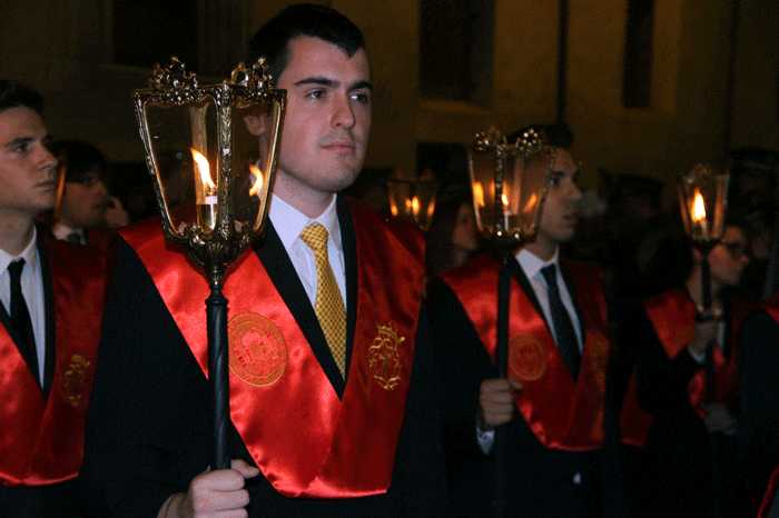 Todos los procesionistas de la UCAM portaron unas becas que les diferenciaban por titulación, y faroles. Durante el recorrido les acompañó el el Presidente y pregonero de la Semana Santa de Murcia, José Luis Mendoza, el padre Antonio Alcaraz, Vicerrector de Extensión Universitaria, coordinador de la actividad y el padre Luis Emilio Pascual, Capellán de la Universidad.