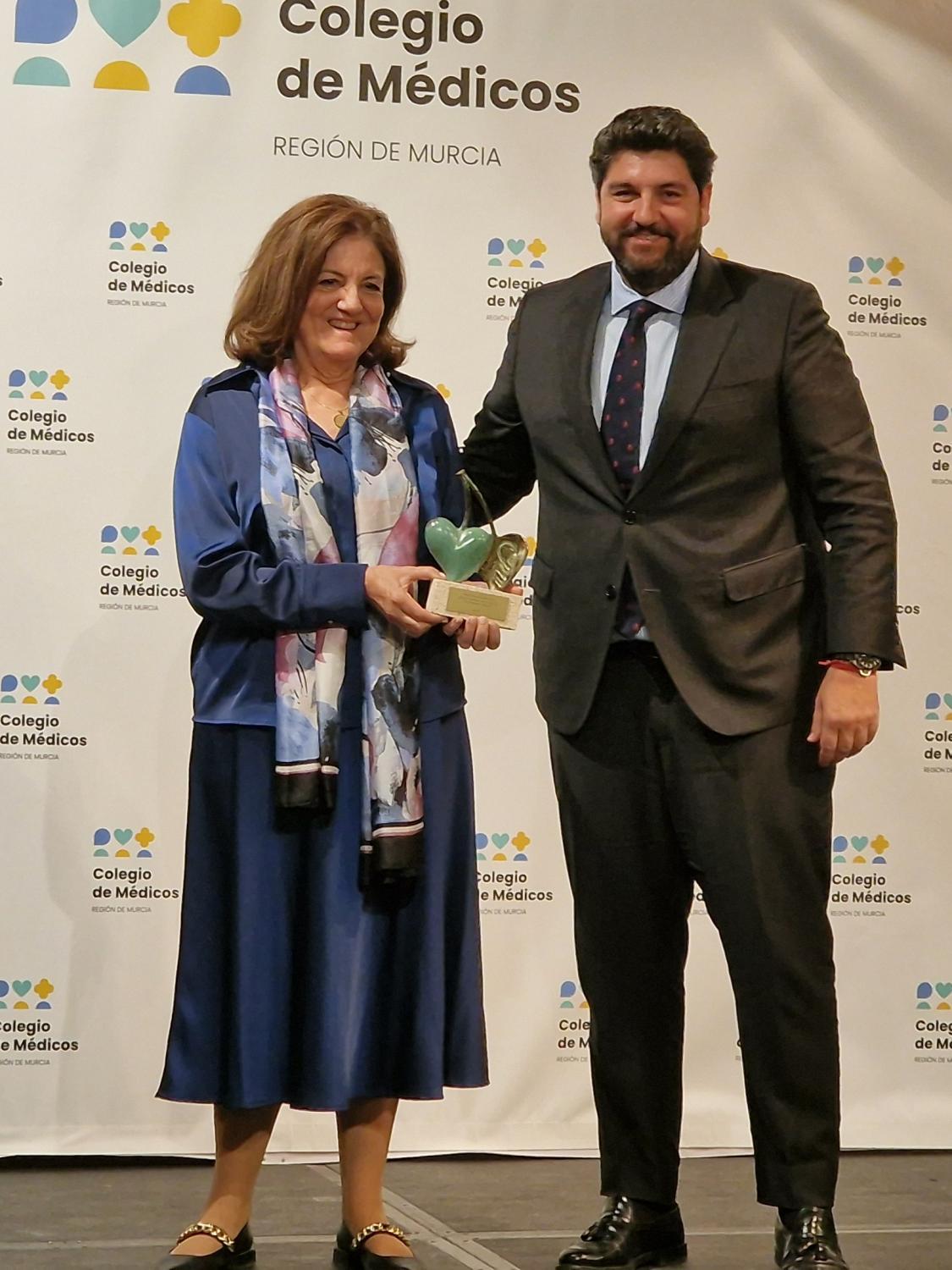 La presidenta de la Universidad Católica de Murcia, María Dolores García Mascarell, recogió de manos del presidente de la Comunidad Autónoma de la Región de Murcia, el Premio Hipócrates, concedido a la UCAM por el Colegio de Médicos de la Región de Murcia, "por su contribución a la profesión médica", tal y como destacó su presidente, Francisco Miralles, en el transcurso de la cena de gala anual en la que se entregaron los galardones, celebrada el viernes por la noche. También fueron homenajeados los doctores Vicente Vicente (por su trayectoria) y Pablo Sánchez Balsalobre (mejor MIR), las ONGs Asociación Pediatría Solidaria y Azul en Acción, y el presidente de la CARM, Fernando López Miras (Colegiado de Honor con Emblema de Oro).
