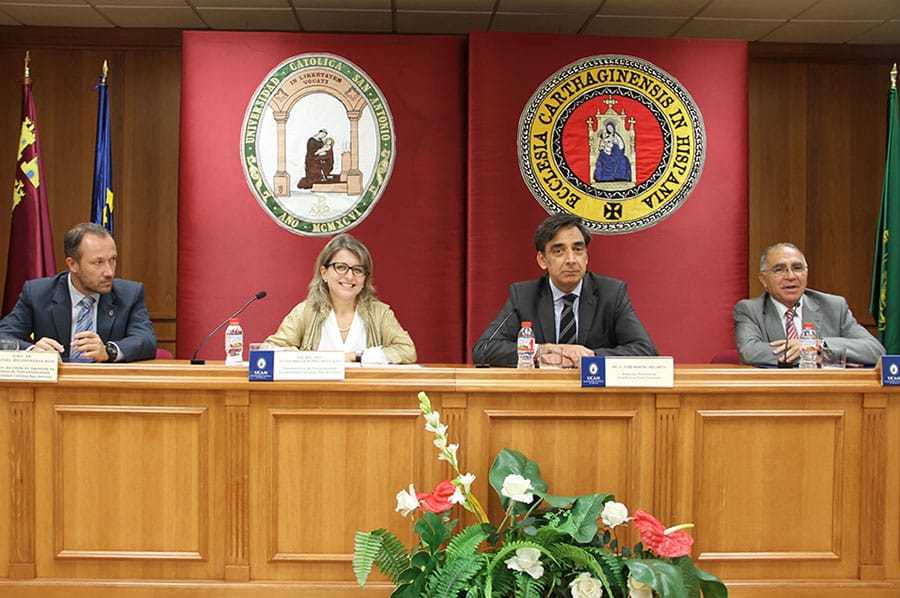 La Universidad Católica de Murcia y Telefónica han presentado las actividades programadas por la Cátedra de Innovación y Emprendimiento en la era digital. En el acto han intervenido Estrella Núñez, vicerrectora de Investigación de la UCAM; José Manuel del Arco, director de Grandes Clientes de Telefónica para Murcia, Baleares y Comunidad Valenciana; el director de la Cátedra, José Carmona, y el vicedecano del Grado en Ingeniería en Sistemas de Telecomunicación, Rafael Melendreras.