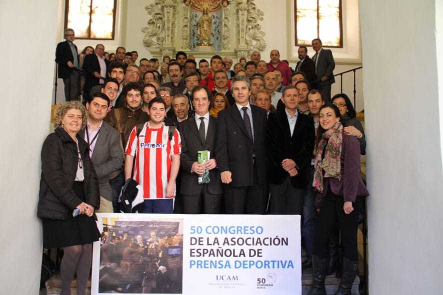 Los estudiantes de la Facultad de Comunicación de la Universidad Católica de Murcia (UCAM), han mantenido esta mañana un encuentro con algunos de los periodistas más destacados del ámbito deportivo, que han acudido esta mañana a la clausura del 50º Congreso de la Asociación Española de la Prensa Deportiva. Personalidades como el presidente de la Asociación de la Prensa Deportiva de Madrid, José Damián González; el presidente de la Asociación de la Prensa Deportiva de Catalunya, Pepe Gutiérrez; el presidente de la Asociación de la Prensa Deportiva de Murcia, Juan de Dios Martínez; el nuevo presidente de la Asociación Española de la Prensa Deportiva, Julián Redondo, y la periodista de Radio Nacional de España, Natalia Ayala, han compartido experiencias con los estudiantes y les han dibujado algunas de las claves para el futuro reciente de esta profesión.