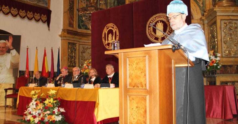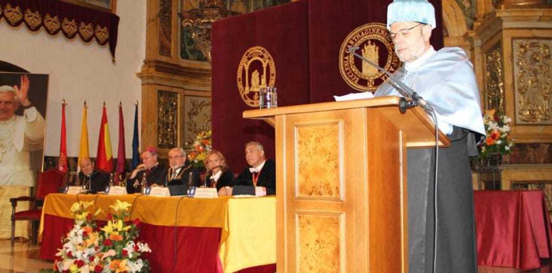 El obispo de Callao (Perú) y nuevo doctor por la UCAM, monseñor José Luis del Palacio, impartió el discurso en representación de todos los doctores.