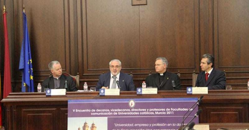 La Facultad de Ciencias Sociales y de la Comunicación de la Universidad Católica fue la encargada de organizar el simposio, en colaboración con la Comisión Episcopal de Medios de Comunicación Social, bajo el lema ‘Universidad, empresa y profesión en la docencia de la comunicación: una convergencia necesaria’. El Obispo de la Diócesis de Cartagena recalcó el hecho de formar a profesionales de la comunicación que defiendan la verdad. Por su parte, el Presidente de la UCAM, recordó que la Universidad Católica de Murcia está al servicio de la Iglesia y destacó que es necesario formar a los estudiantes no sólo como buenos profesionales de la Comunicación sino también a través de la verdad y la justicia.