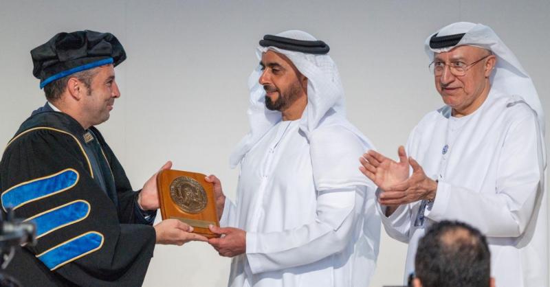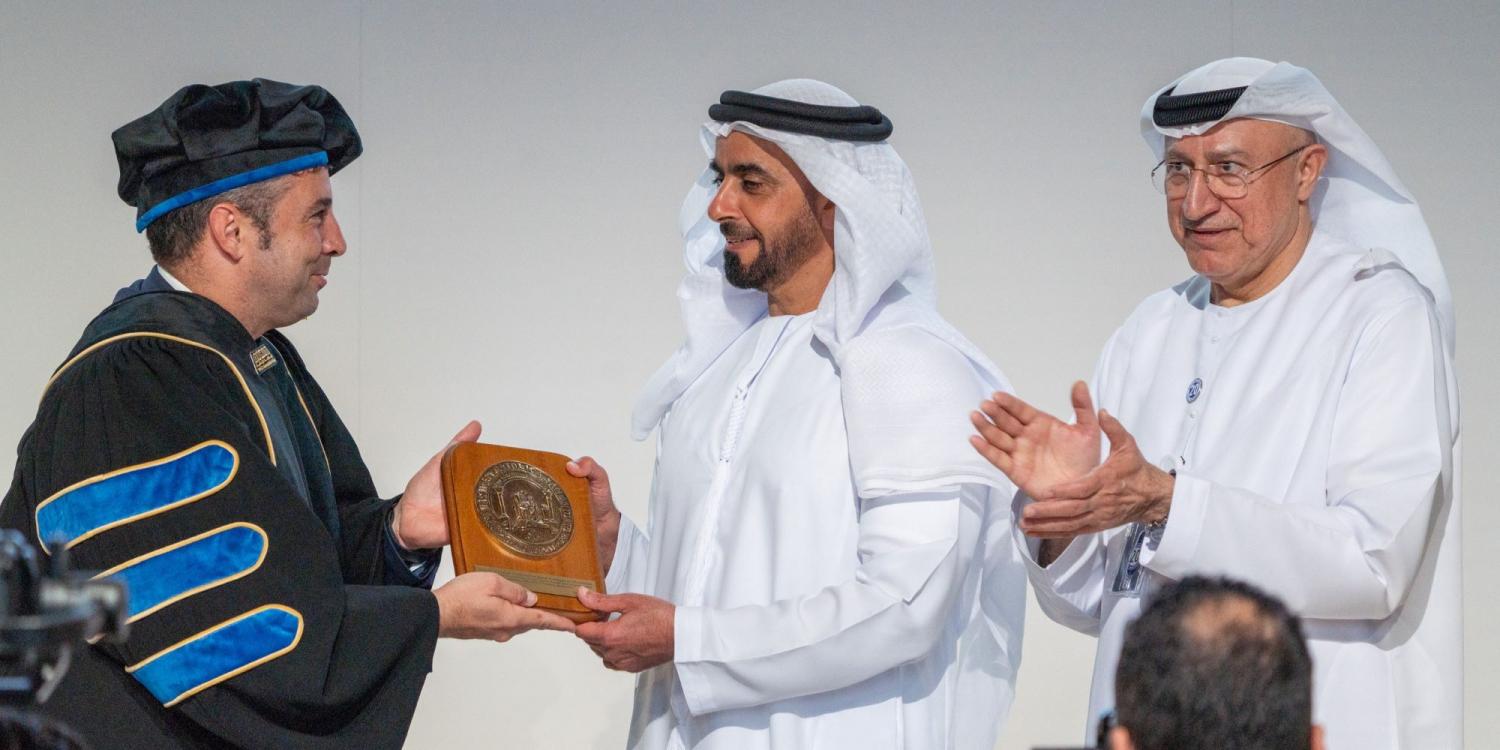 Uno de los momentos más emotivos del acto llegó cuando José Luis Mendoza entregó a Saif bin Zayed Al Nahyan, en reconocimiento a su apoyo y contribución al programa, una metopa de la UCAM y un diploma que le acredita como Catedrático Extraordinario en Acción Humanitaria Sostenible.
