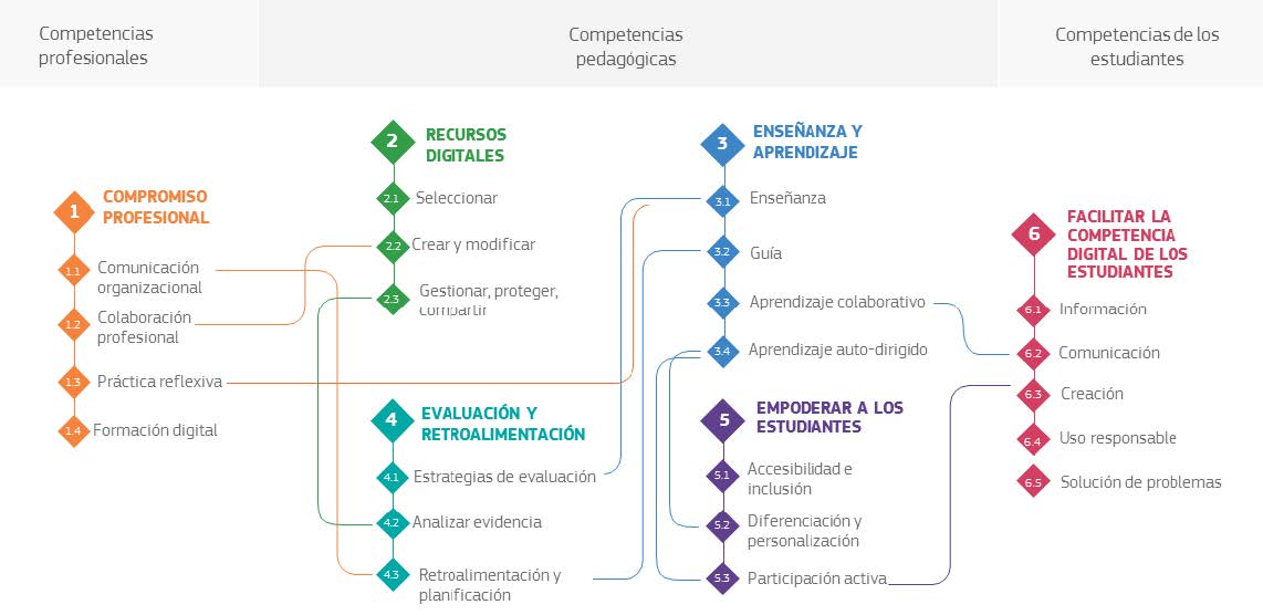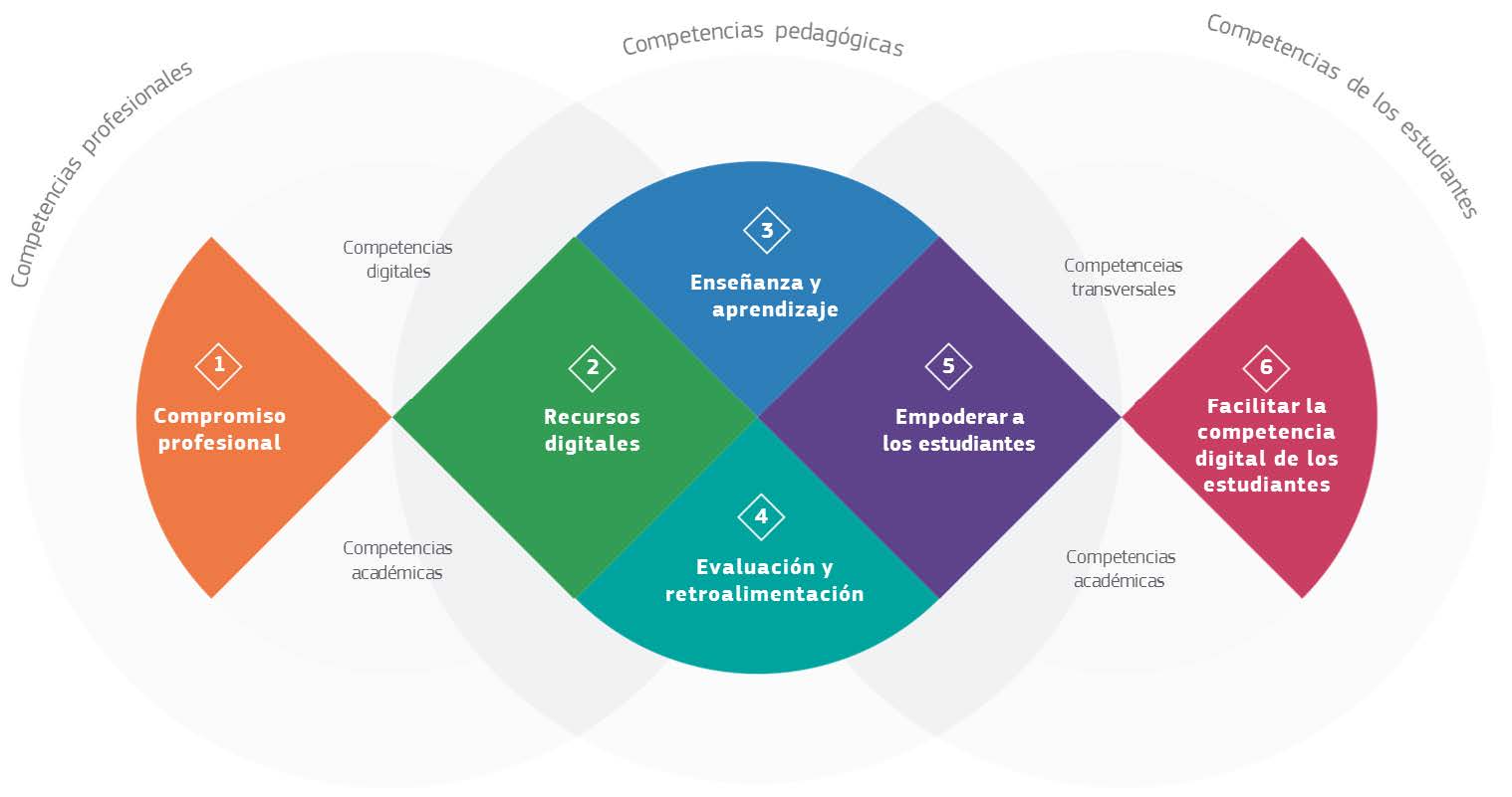 DigCompEdu considera seis áreas de competencias diferentes con un total de 22 competencias. Las áreas 2 a 5 constituyen el núcleo pedagógico del marco.