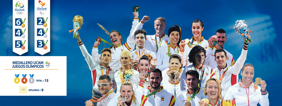 Por un lado, está el trabajo conjunto con el Comité Olímpico Español por el cual la UCAM ayuda a cientos de deportistas con una triple vía: patrocinio deportivo, beca en los estudios y tutorización personalizada. Gracias a este trabajo, más de sesenta deportistas de la UCAM participaron en los Juegos de Río 16 obteniendo unos excelentes resultados: 15 medallas y 9 diplomas olímpicos; y 9 medallas y 3 diplomas paralímpicos. Deportistas como Mireia Belmonte (natación), Carolina Marín (bádminton), Ruth Beitia y Miguel Ángel López (atletismo), Lidia Valentín (halterofilia), Javier Fernández (patinaje sobre hielo), Saúl Craviotto (piragüismo), Mario Mola (triatlón) o Joel González (taekwondo) son algunos de los deportistas de la UCAM más destacados.