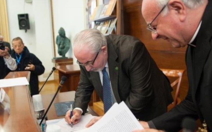 Monseñor Vincenzo Paglia, gran Canciller del Pontificio Instituto Teológico Juan Pablo II, y José Luis Mendoza, presidente de la Universidad Católica de Murcia (UCAM), oficializaron los acuerdos ayer en Roma que permitirán crear un Grado y un Máster online