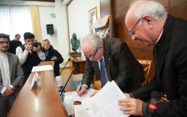 Monseñor Vincenzo Paglia, gran Canciller del Pontificio Instituto Teológico Juan Pablo II, y José Luis Mendoza, presidente de la Universidad Católica de Murcia (UCAM), oficializaron los acuerdos ayer en Roma que permitirán crear un Grado y un Máster online