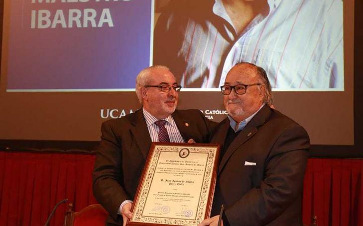 José Luis Mendoza, presidente de la UCAM, anuncia, en un acto de homenaje al veterano periodista murciano, que será nombrado Catedrático Extraordinario de Periodismo Deportivo