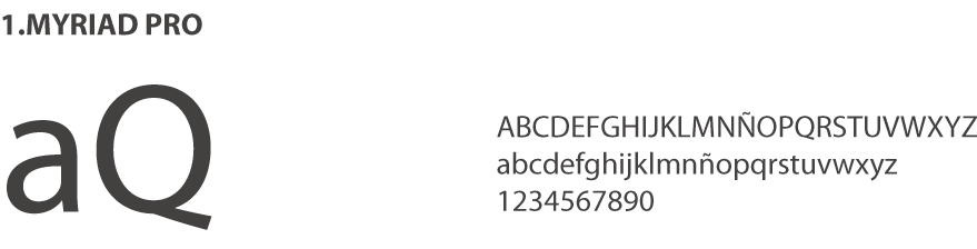 La tipografía Myriad Pro es una tipografía muy flexible y agradable a la vista. Tiene modernos remates y una identidad y personalidad propia. Cuenta con versión Regular, semibold y bold. Así como sus variantes en itálica y condensada.